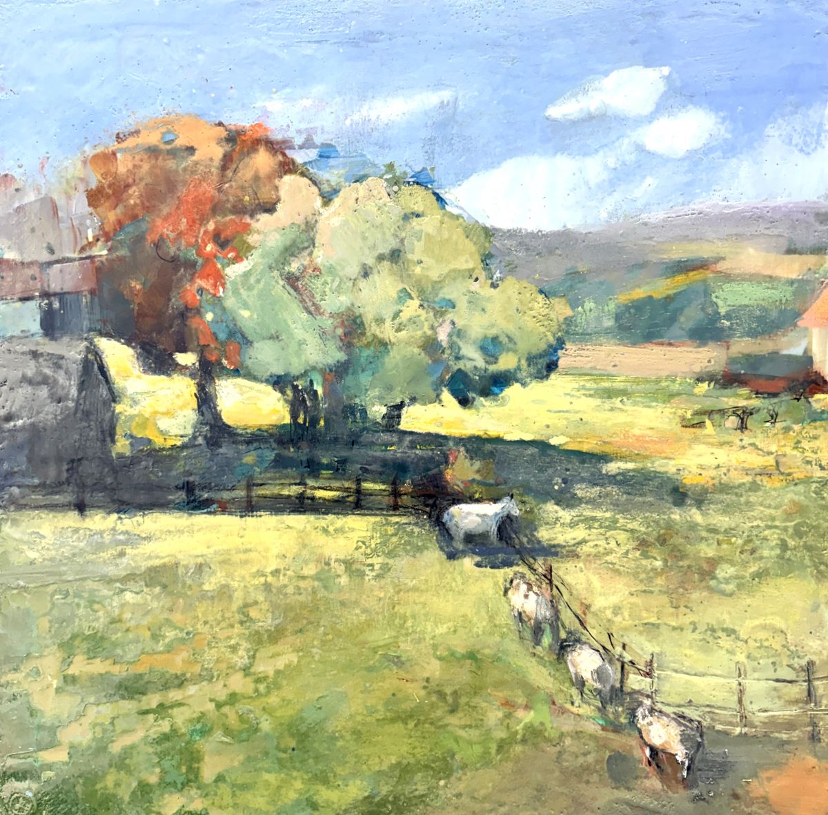 This painting began with a sweet little moment at the Waterford Fair. I was wandering through the village when I noticed a line of sheep making their way across a pasture, each one trailing the next like they were playing a quiet game. It was so simple and so endearing that I stopped right there to take it in. The trees were just starting to turn, and the whole scene felt like a page from a storybook.